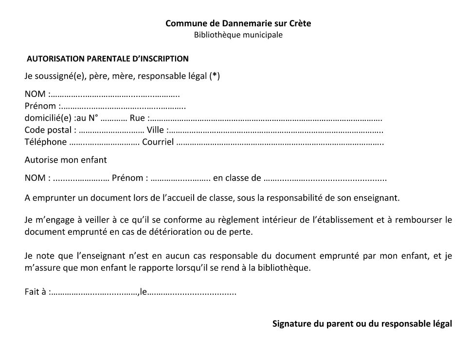 copie du document à retourner : autorisation parentale bibliothèque pour l’école